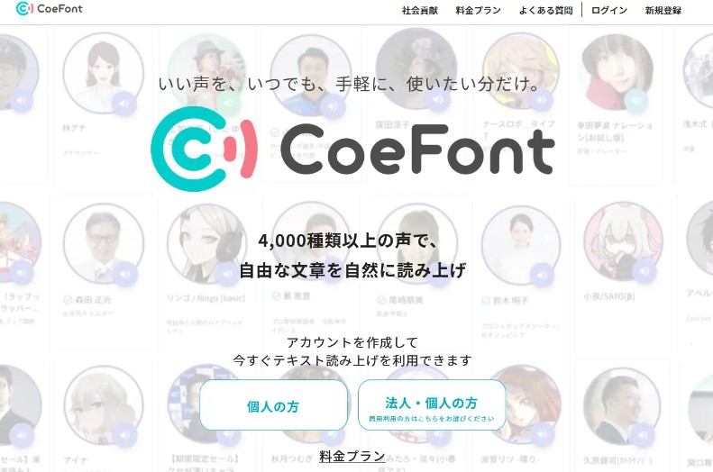 日本語環境を重視する場合は、CoeFontも候補に入ります。公式の料金ページでは、Freeプランでも custom AI voice の作成が案内されており、まず試すこと自体はしやすい構成です。加えて、CoeFont Interpreter 側では、自分の声を使った AI Voice Creation が日本語に限って利用できる案内もあります。