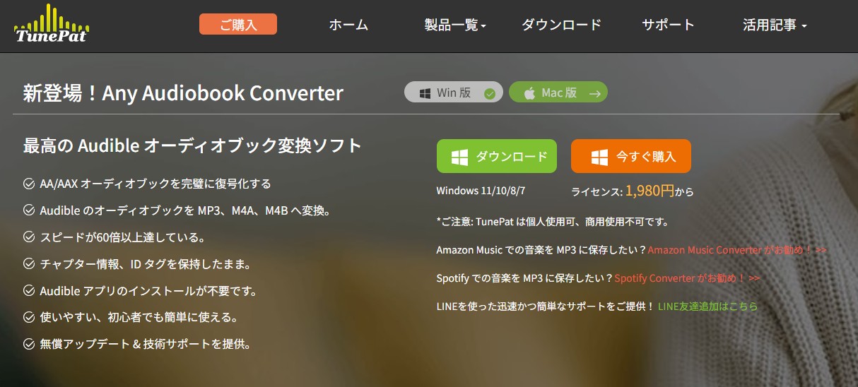 | TunePat Any Audiobook Converter | ○ | MP3/M4A/M4B | 最大60倍速 | ○ | 各作品の最初1分のみ変換 | 日本語UI完備、操作が直感的で初心者にも最適 |