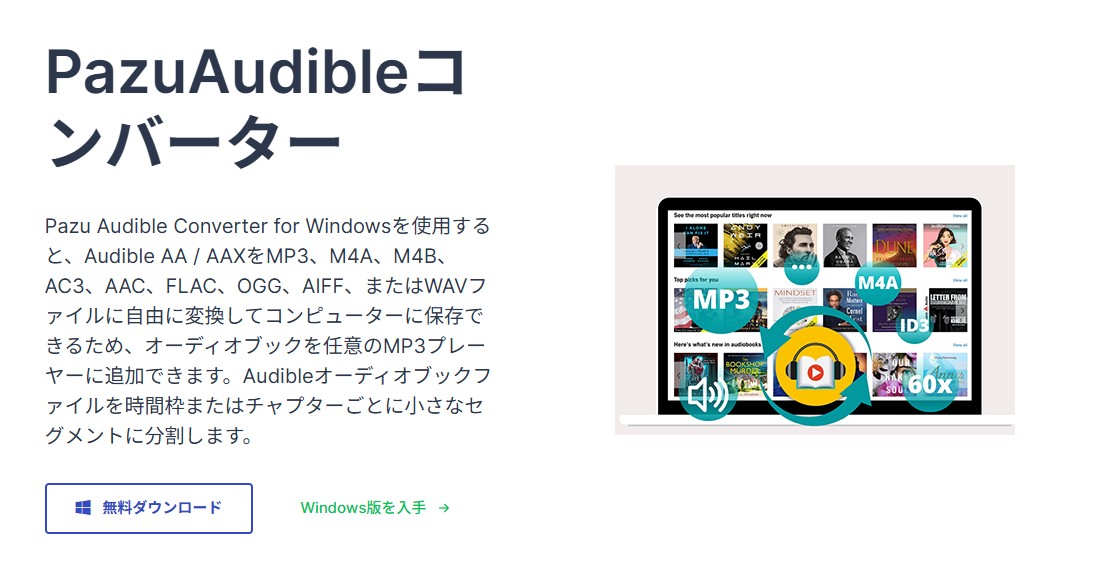 | Pazu Audible コンバーター | ○ | MP3/M4A/M4B/FLAC/OGG/WAV | 最大60倍速 | ○ | 変換時間に制限あり | 対応形式が豊富で、軽量ながら安定した動作が特徴 |