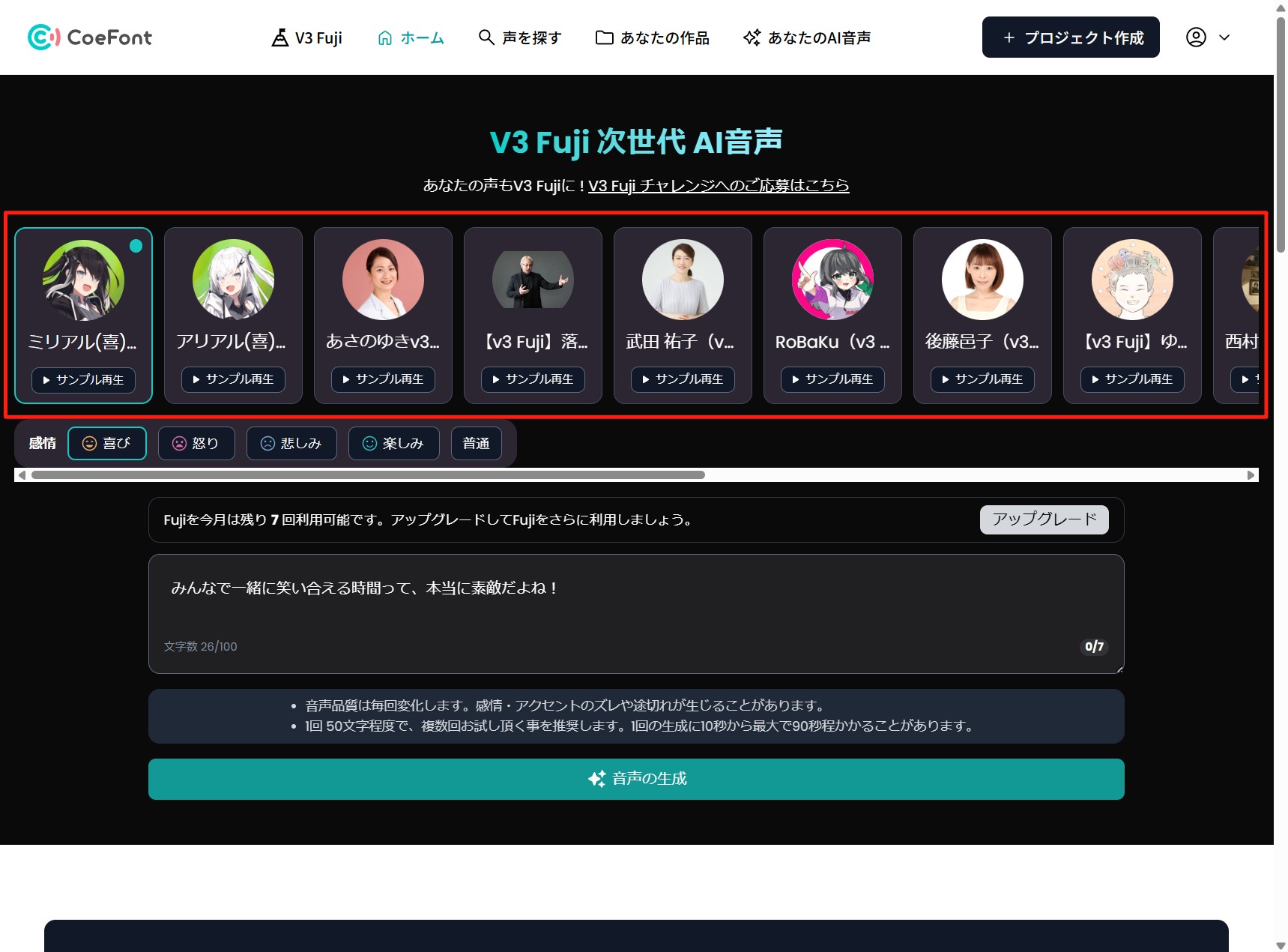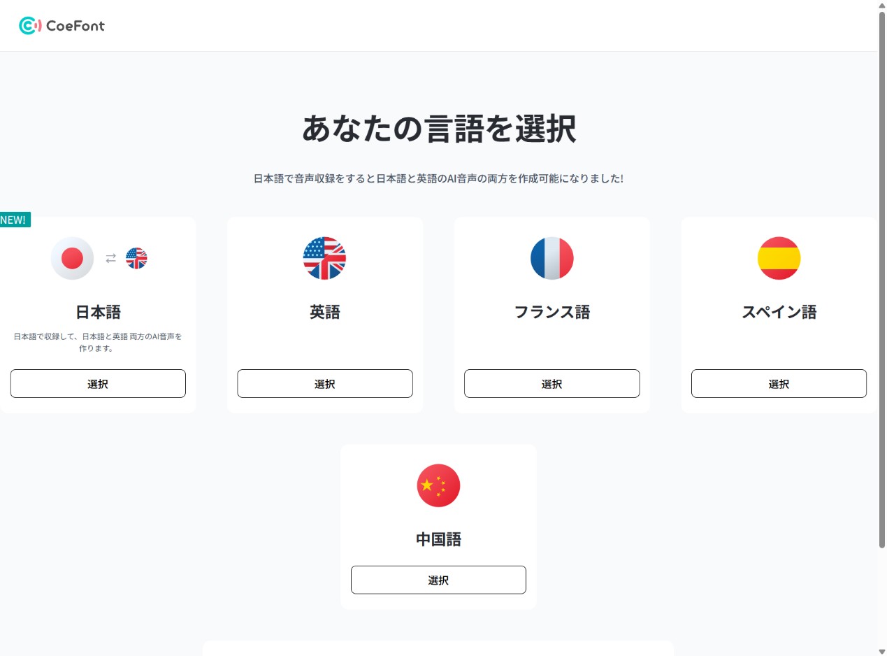 このように、CoeFontの無料プランは、主に個人利用や非営利目的に限定されています。無料プランでは、登録後すぐに3種類のAI音声とボイスチェンジャー機能を使って、テキストを音声に変換できます。対応言語は日本語・英語・中国語を含む多言語で、短いナレーションやSNS用動画の作成などに十分対応可能です。
