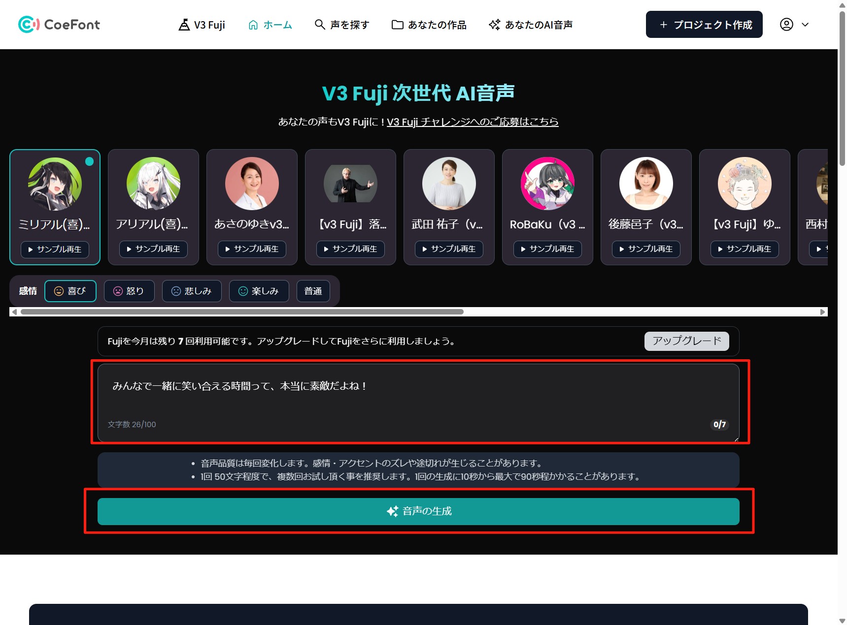 4.生成したい音声のテキストを入力し、「音声の生成」ボタンをクリックします。