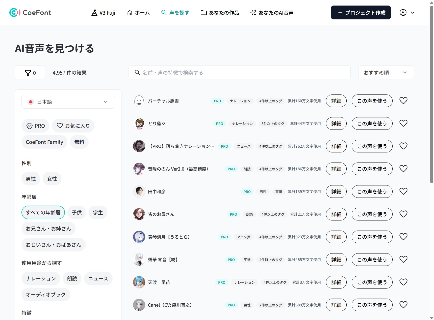 3.画面上部にある「声を探す」メニューから、さらに多くの音声ライブラリを検索して利用することができます。