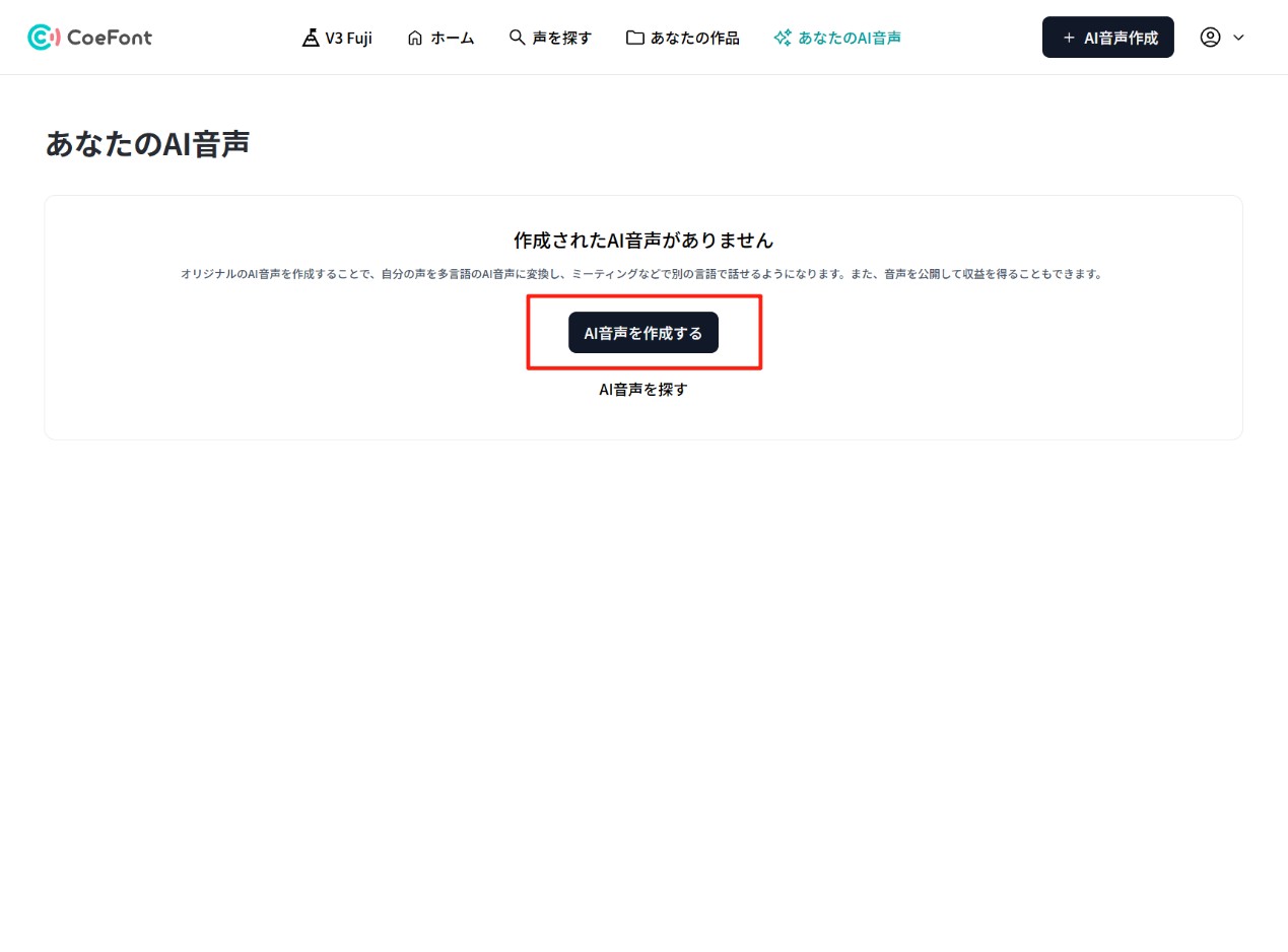 1.画面上部の『あなたのAI音声』をクリックして作成画面へ進み、『AI音声を作成する』を選択します。