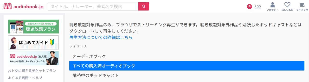 オーディオブックをすでに購入した場合、右上の「ライブラリ」を開きます。その中にある 「すべての購入済オーディオブック」 が、購入したオーディオブックも確認してさらにダウンロードページに入ることができます。