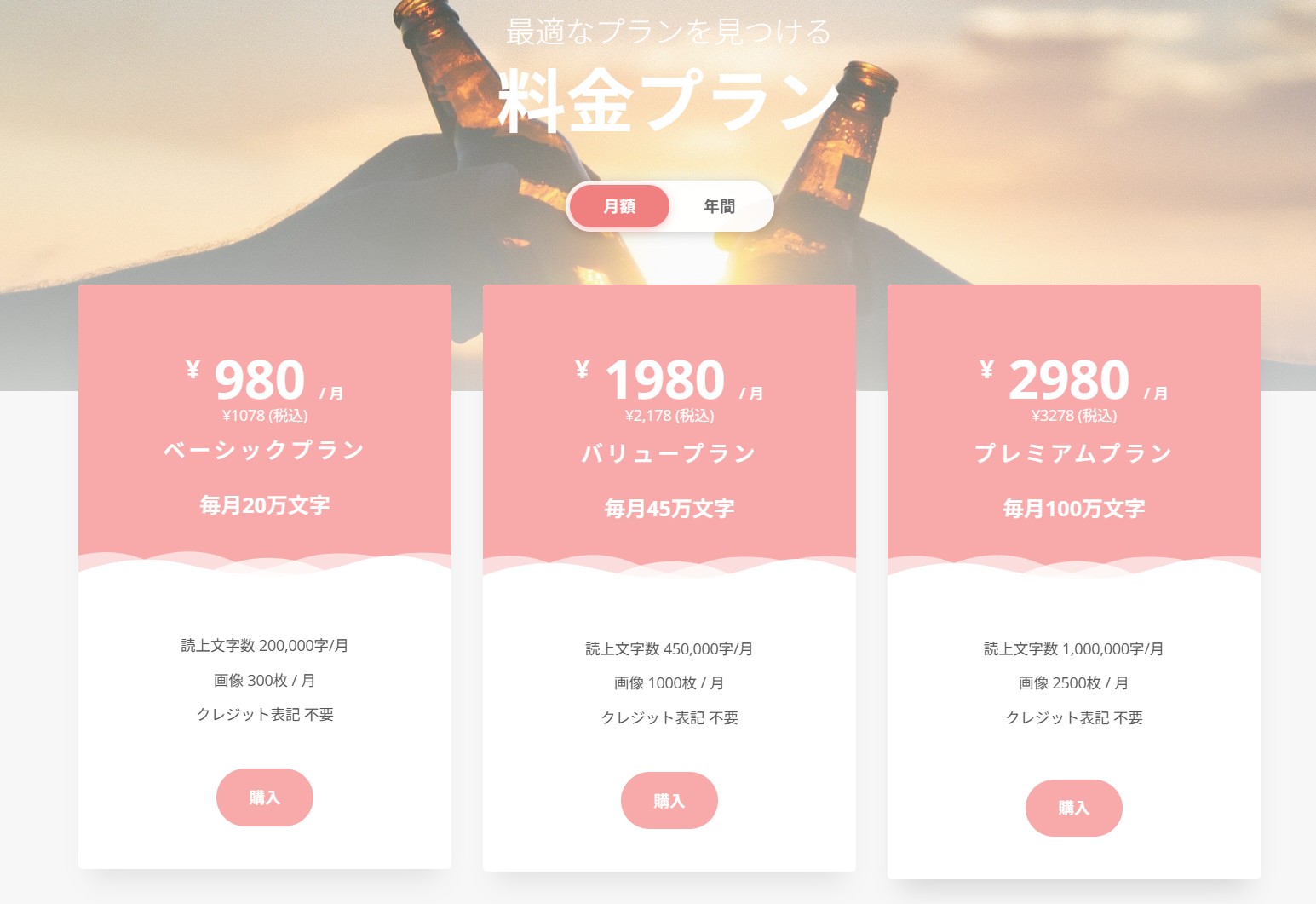 クレジット表記を消したい場合や、個人のYouTube・SNS運営などで長文を扱う場合は、月額制の一般向けプランを契約します。