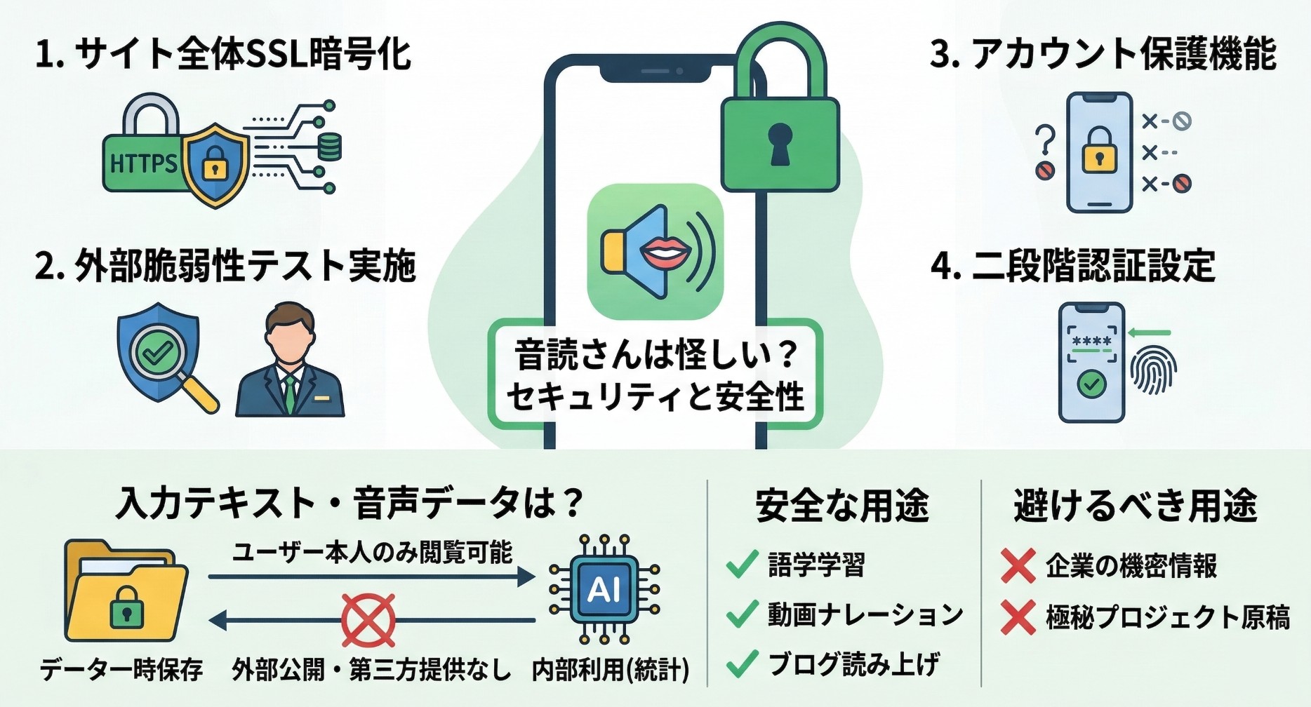 基本的には、語学学習、動画のナレーション作成、ブログの読み上げなど、日常的な用途であれば安全に利用できるサービスです。とはいえ、クラウド上のツールである性質上、企業の機密情報や公開前の極秘プロジェクトの原稿などを入力するのは避けるのが、一般的なWebサービスを利用する上での基本ルールのひとつです。