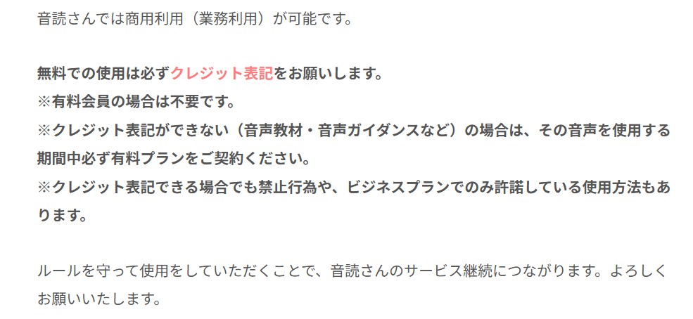 無料プランであっても、YouTube動画のナレーションやSNS投稿など、商用コンテンツに音声を使用すること自体は可能です。ただしその場合、概要欄や動画内など、利用者の目に留まる場所に「音読さん」などのクレジット表記が必須となります。クレジット表記さえすれば、無料のままでも広告収入を得るYouTube動画などに利用できます。