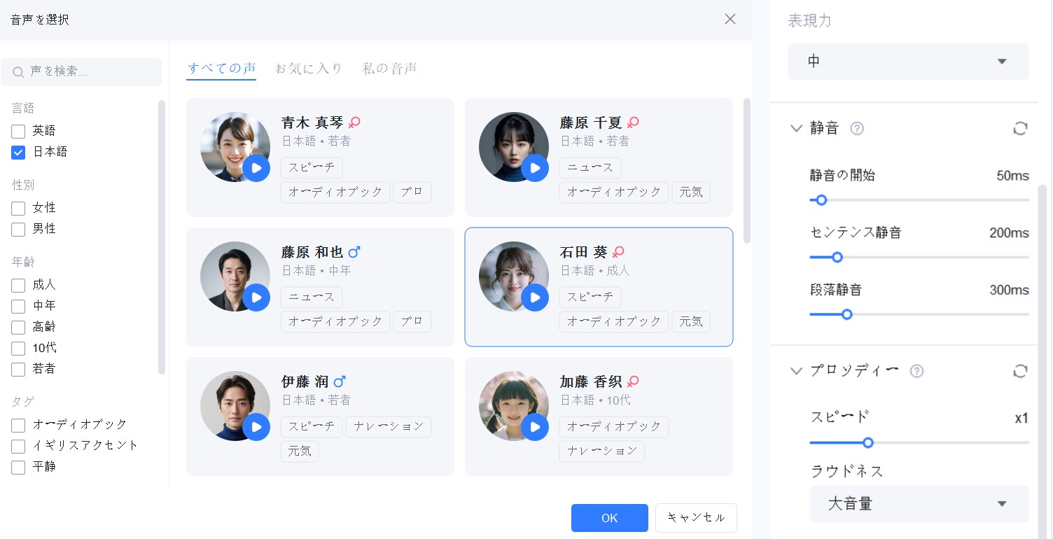 性別・年齢・スタイルなどに応じて、多数のプリセット音声から選択でき、自分の声をクローンすることも可能です。