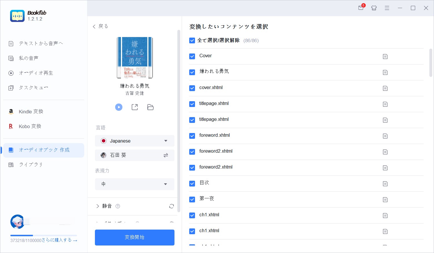 - 個人的に言うと、BookFab AudioBook 作成はその優れた朗読機能と個人設定オプションで際立ちます。EPUBフォーマットをサポートするだけでなく、多種の声の選択や調整オプション(速度や感情の豊かさなど)を提供し、ユーザーは自分の好みに合わせて聴書体験をカスタマイズすることができます。機能が豊かで、個人化された聴書体験を提供するEPUB Readerを探している場合は、BookFab AudioBook 作成は最高な選択肢です。