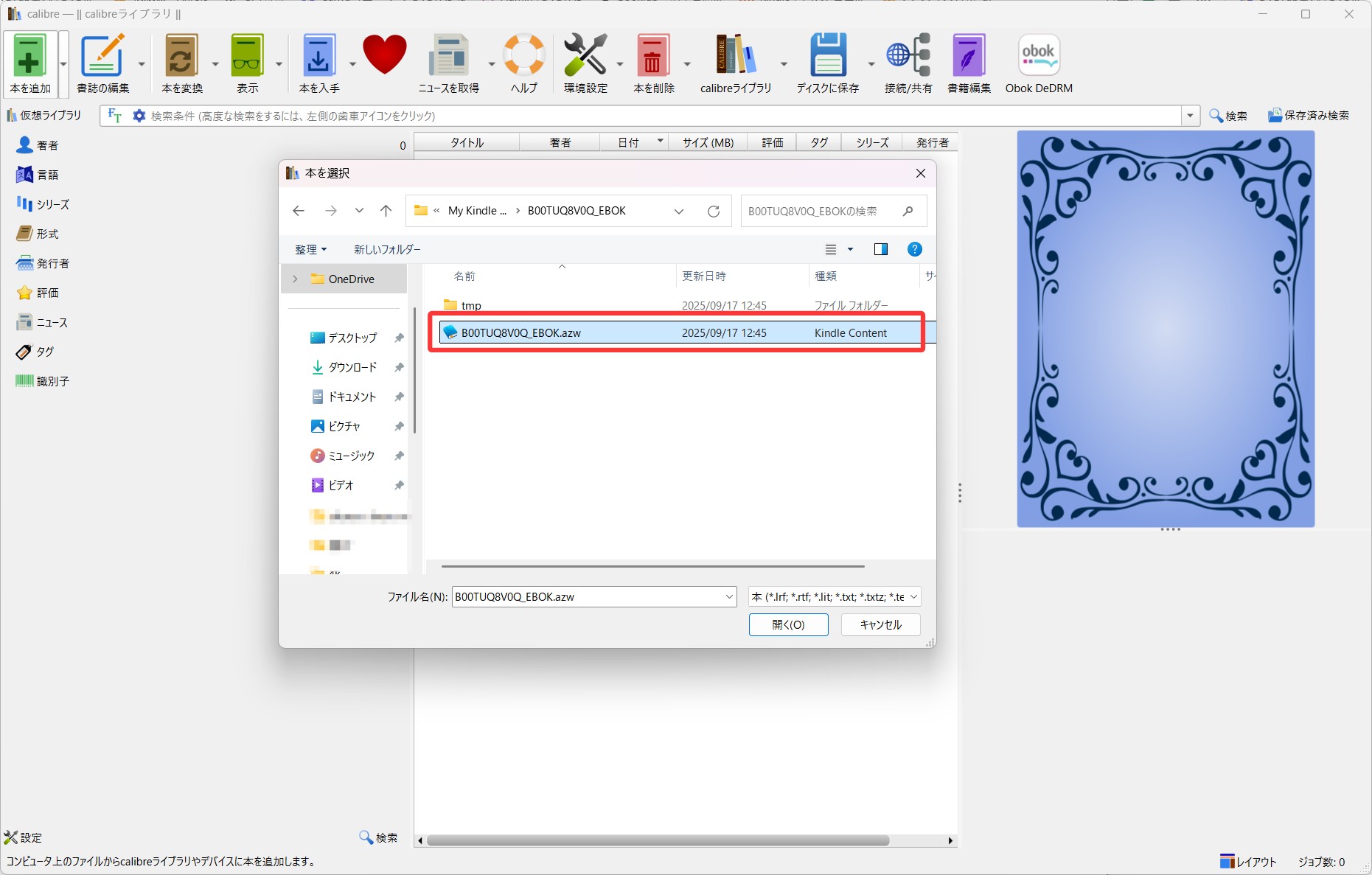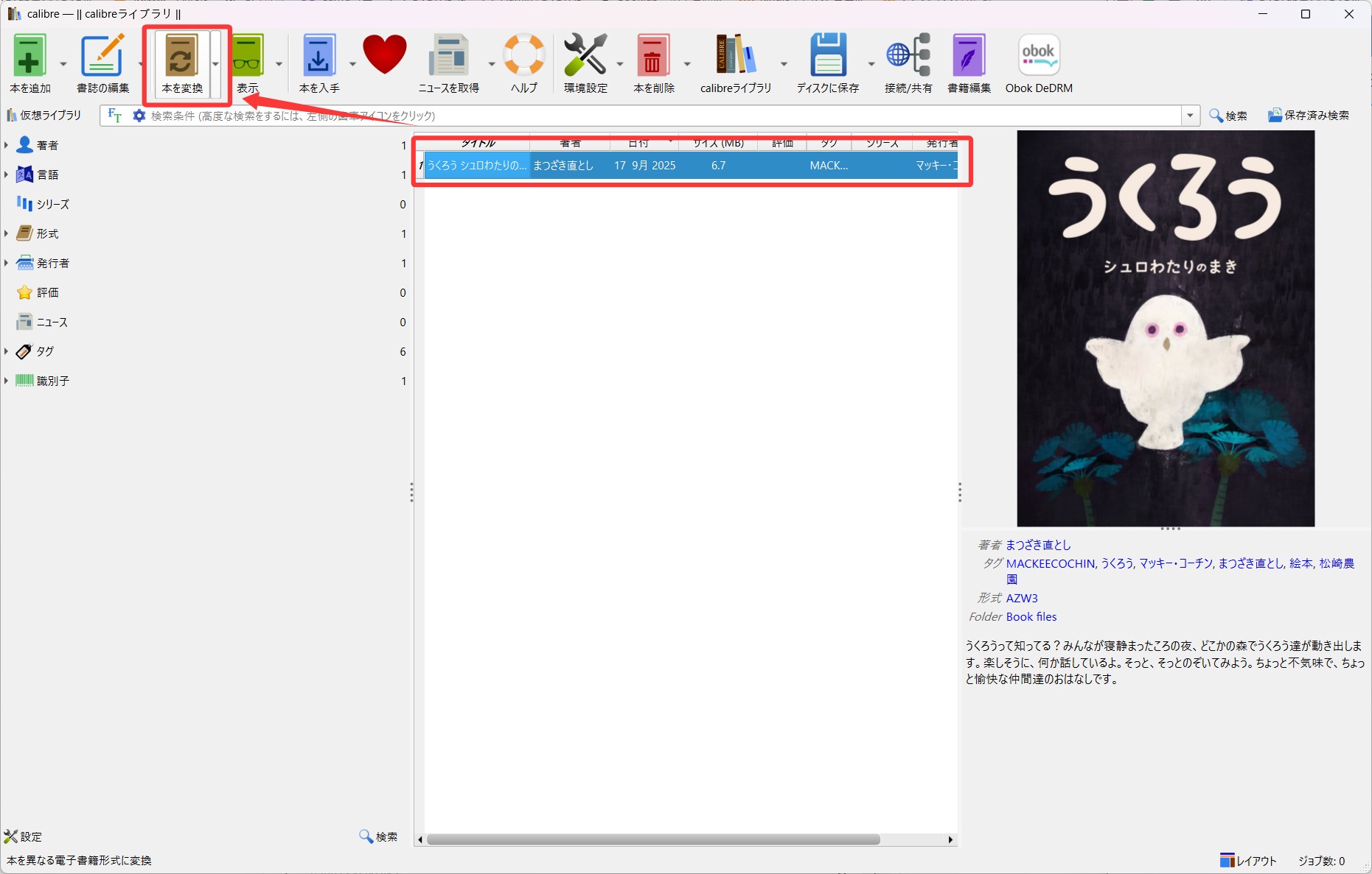 次に、実際のKindle電子書籍ファイルをCalibreに取り込み、変換してみましょう。