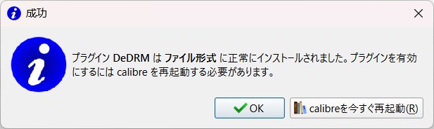 インストール成功しましたら、ポップアップウインドウが表示されます。calibreを今すぐ再起動をクリックし、再起動します。こでれ、DeDRMプラグインの追加が完了です。