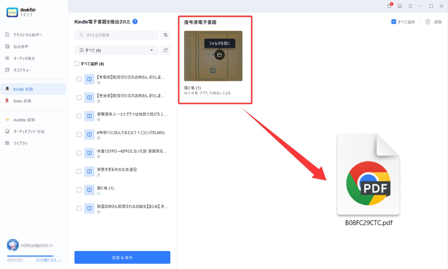 変換が完了すると、書籍は「復号済電子書籍」として表示されます。「フォルダーを開く」をクリックすれば、変換後のファイルが保存されている場所をすぐに確認できます。
