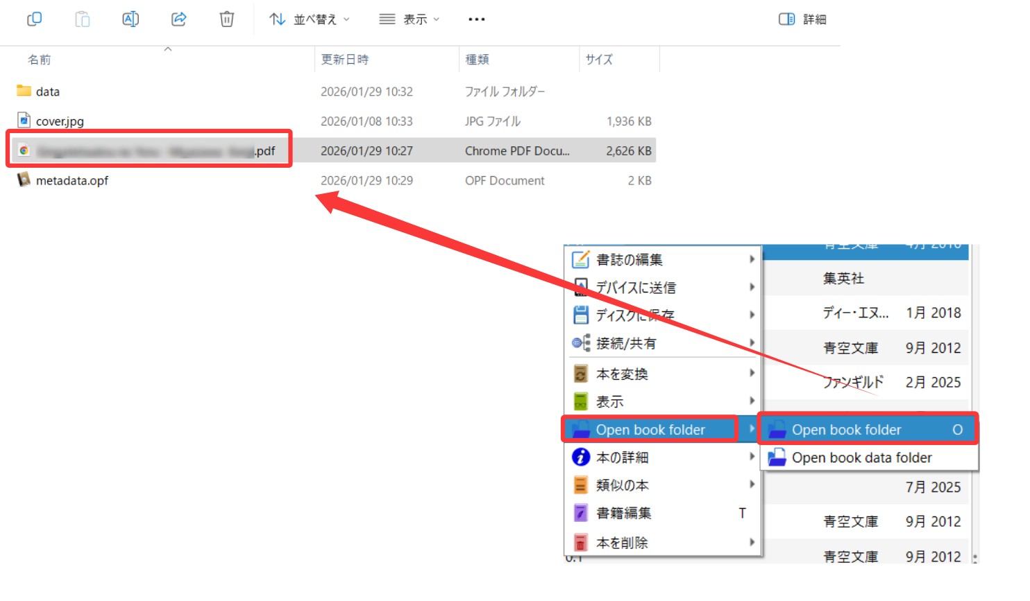解除後、DRMフリーのファイルは同じ書籍エントリに自動的に付与されるため、フォーマット変換、メタデータ編集、整理など、他の書籍と同様に扱えます。
