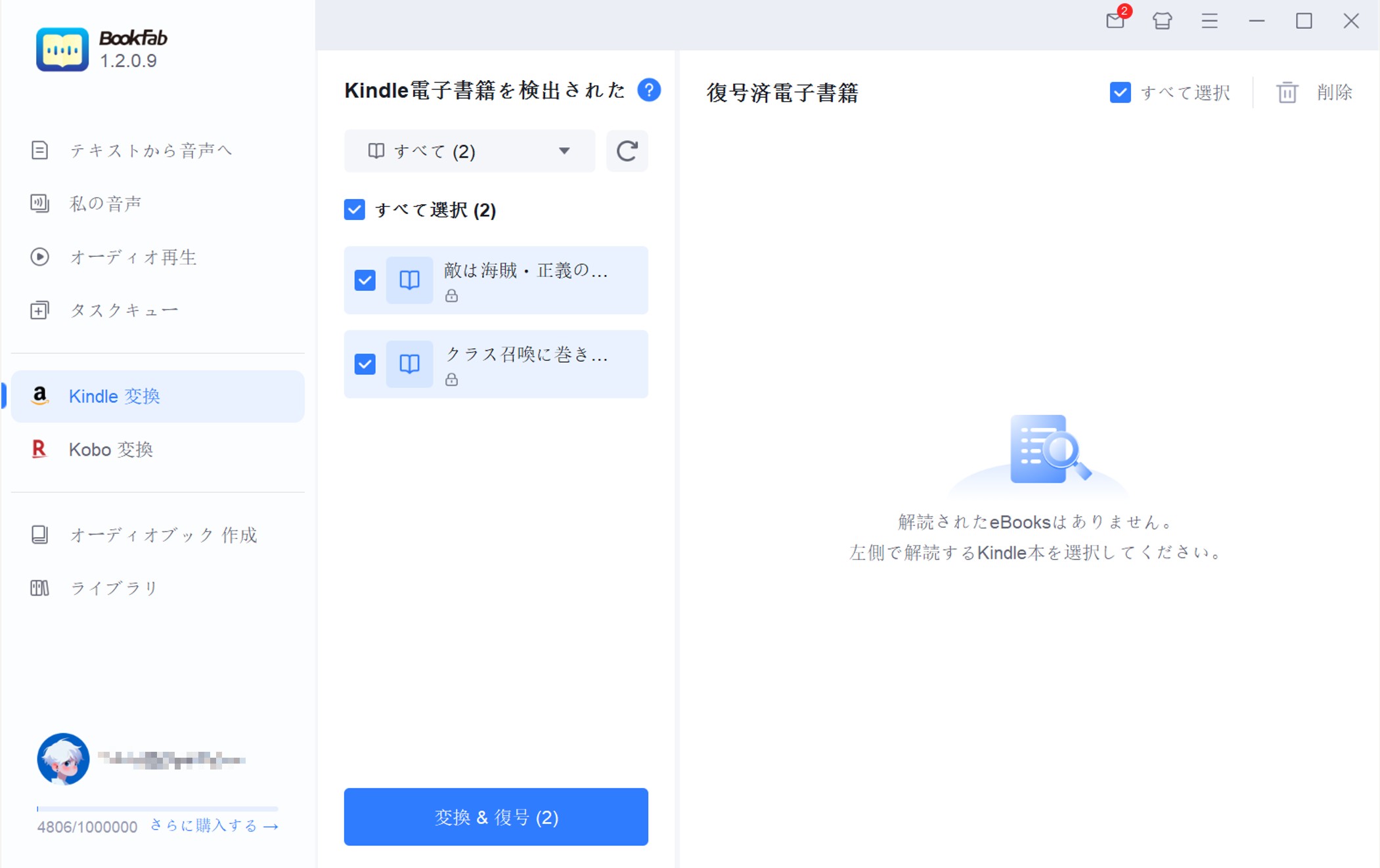復号したい電子書籍を選び、下の「変換&復号」ボタンをクリックします。BookFab Kindle 変換が自動的にファイルを解析・復号します。復号が完了すると、左側リストのステータスが更新されます。