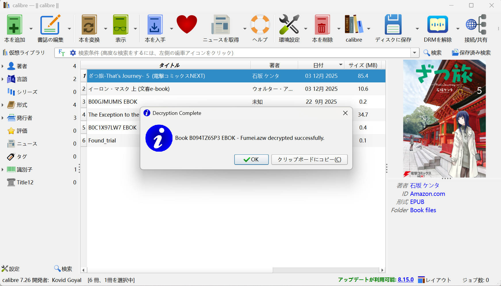- 解除後の本は、自動でCalibreライブラリへ即座にインポート