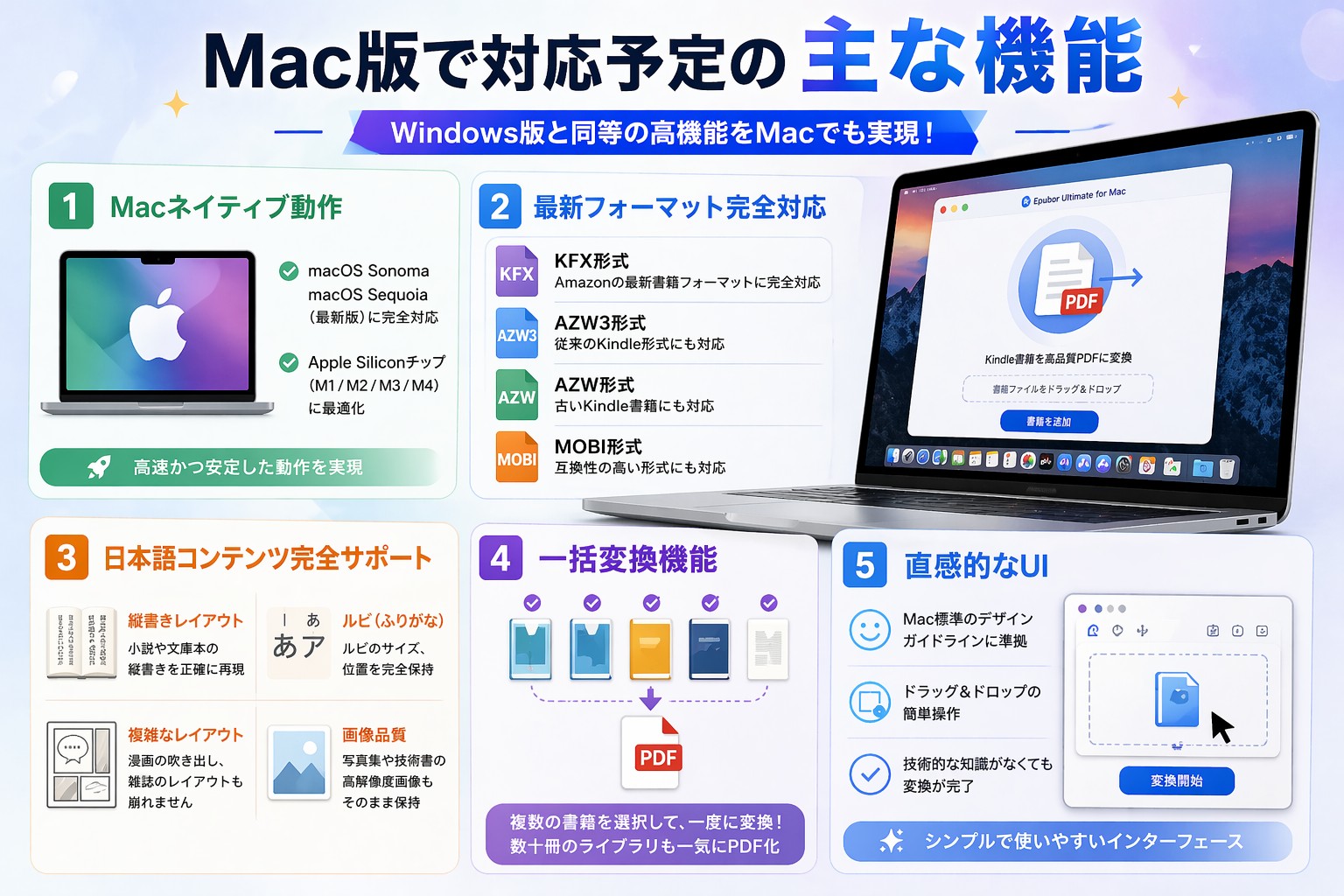 対象ユーザー:すべてのMacユーザー、DRM保護された書籍(最新のKFX形式など)も対応可能