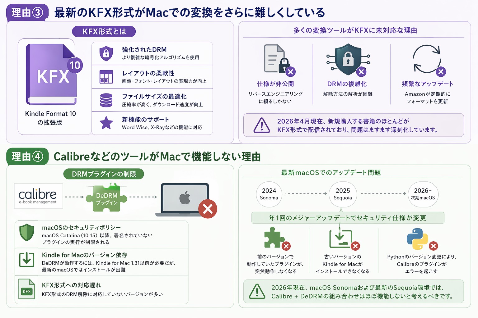 2026年現在、macOS Sonomaおよび最新のSequoia環境では、Calibre + DeDRMの組み合わせはほぼ機能しないと考えるべきです。