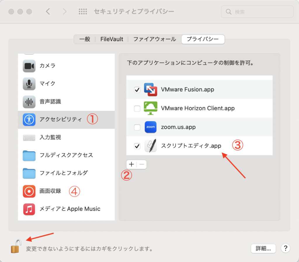 スクリプトでキーボード操作を自動化するため、事前にMacの「システム設定」>「プライバシーとセキュリティ」>「アクセシビリティ」を開き、使用するアプリ(「スクリプトエディタ」または「Automator」)のスイッチをオンにして許可を与えてください。