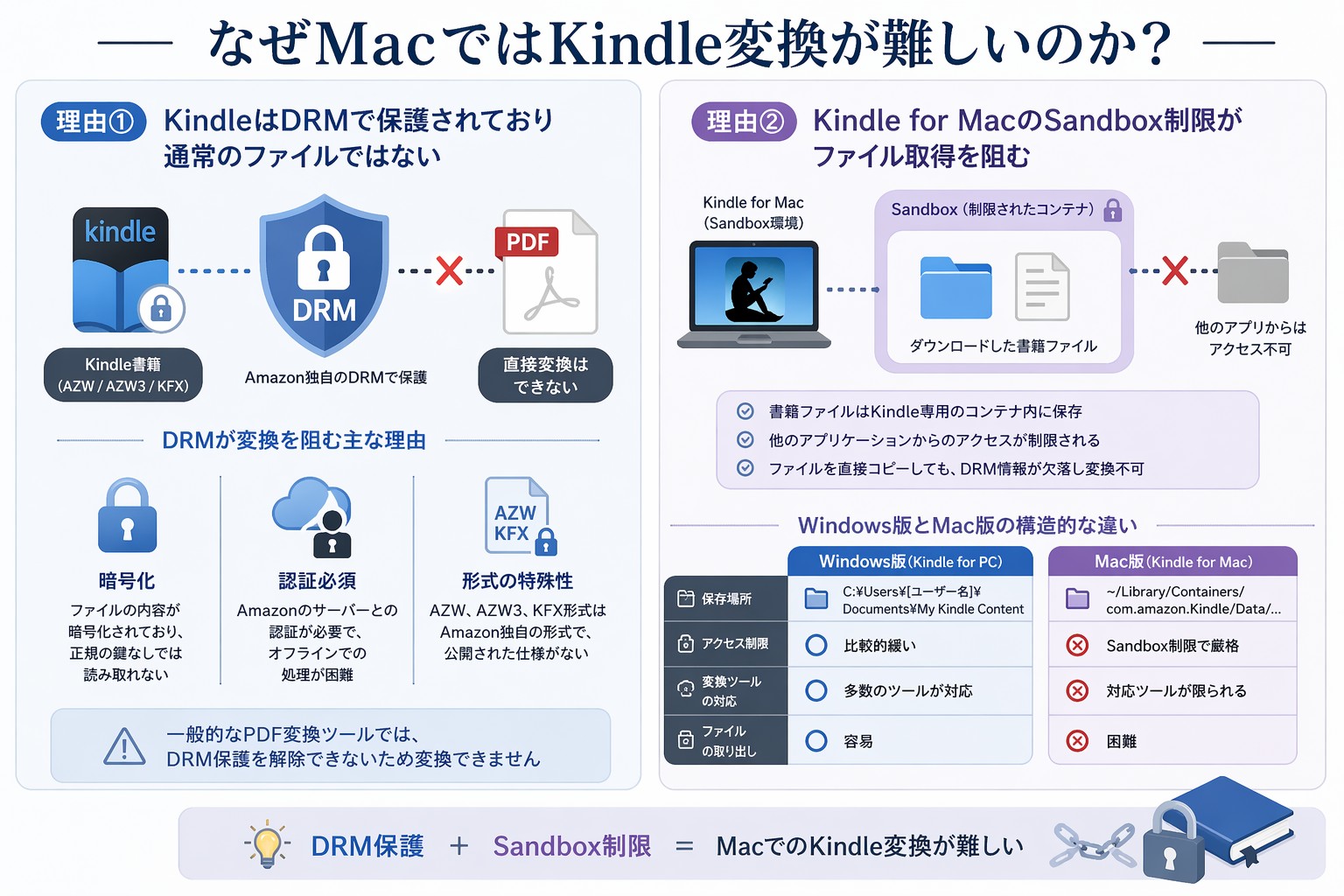 Windows版のKindle for PCは、比較的アクセスしやすいフォルダにファイルを保存しており、変換ツールからのアクセスが容易です。一方、Mac版はSandbox制限により、以下のような違いがあります: