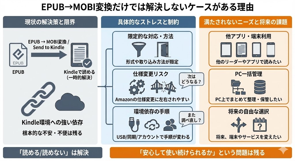 EPUBをMOBIに変換したり、Send to Kindleを使ってKindleで読める状態にできたとしても、それで不安や不便が完全に解消されるとは限りません。多くの人が感じている本当のストレスは、ファイル形式そのものではなく、Kindleという特定の利用環境に強く依存している点にあります。
