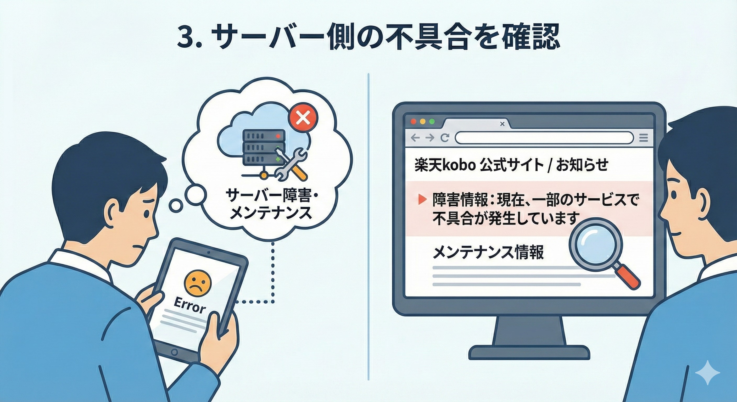 ユーザー側の設定に問題がなくても、楽天koboのサーバー側で一時的な障害が発生しているケースもあります。この場合、何度操作を繰り返しても改善しないことが多いため、楽天kobo公式サイトやお知らせページで、障害情報やメンテナンス情報が出ていないかを確認してみましょう。