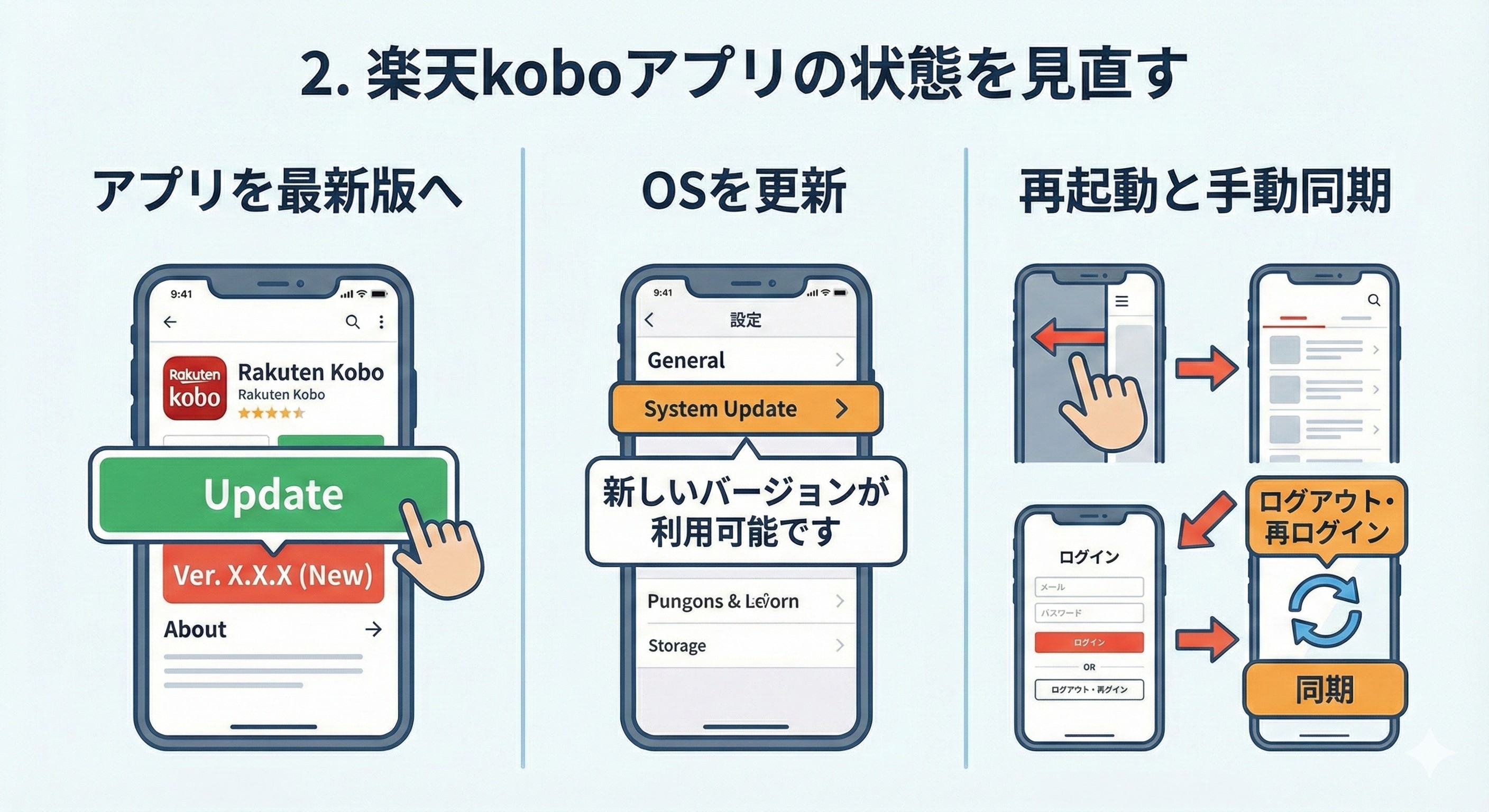 楽天koboアプリや端末のOSが古いままになっていると、正常に動作しないことがあります。アプリストアから最新版にアップデートされているかを確認し、OSについても更新が可能であれば適用しておきましょう。