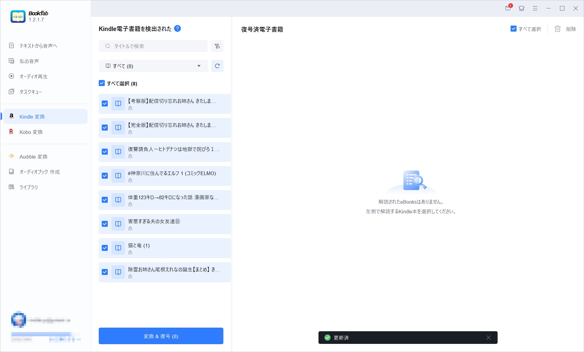 形式を決めたら、変換したい漫画や書籍を選択し、「変換&復号」をクリックすると処理が始まります。