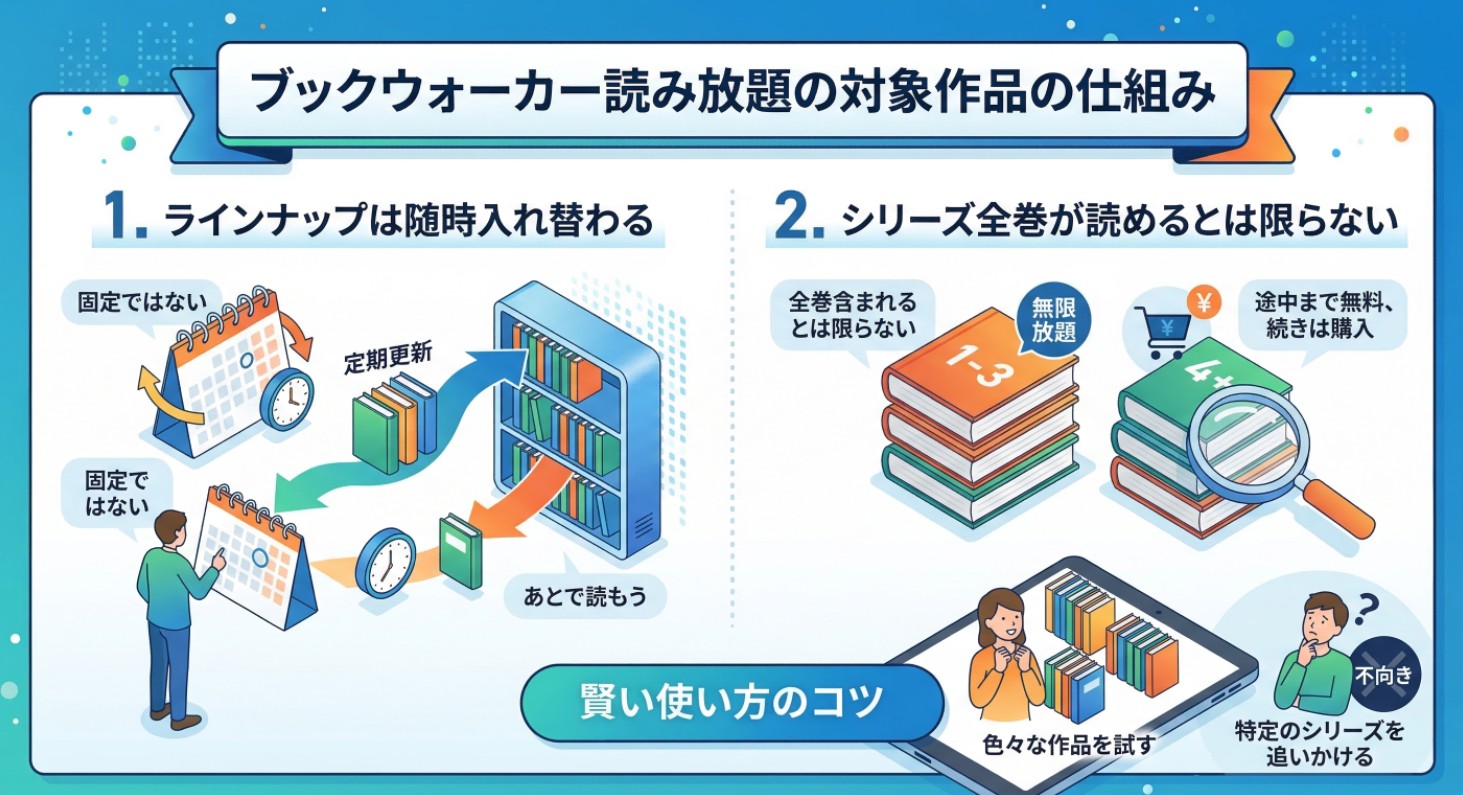 まず知っておくべきポイントは、BookWalker読み放題対象となる作品のラインナップがずっと固定されているわけではないということです。