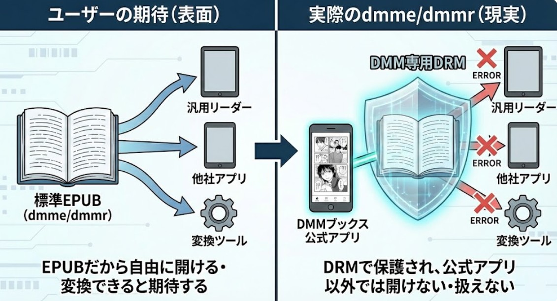 dmmeとdmmrはいずれもEPUBをベースにした配信形式ですが、DMMブックス向けにDRMが適用された状態で提供されます。そのため、一般的な電子書籍ストアで配布されるEPUBのように、汎用リーダーや他社アプリで自由に開いて読めるわけではありません。