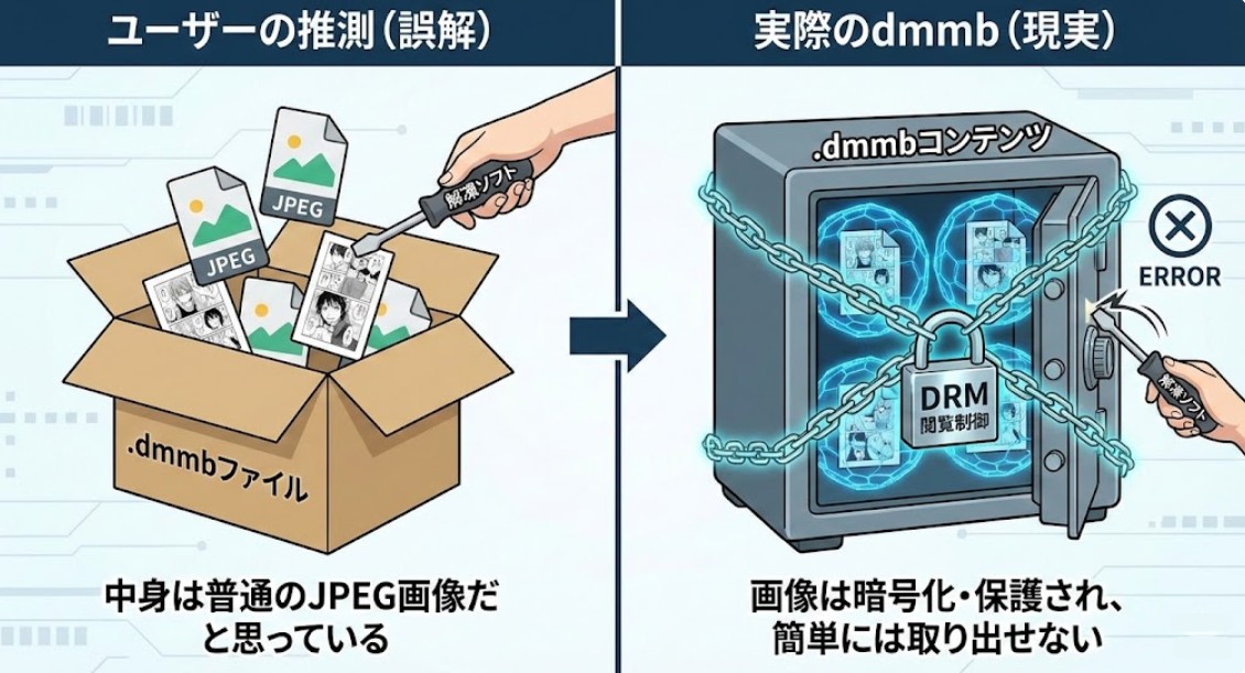 その背景には、DMM独自の特殊なファイル構造と、閲覧アプリと深く紐付いた強力なDRM保護(デジタル著作権管理)が存在します。なぜ単純な変換が通用しないのか、その仕組みをファイル形式(.dmme / .dmmb)の観点から解説します。
