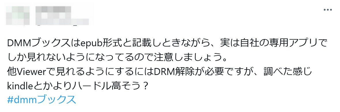 たとえ販売ページに「EPUB」という表記があったとしても、それは「元データがEPUBで作られている」という意味に過ぎず、配信されるデータ自体はDMM独自のDRMでカプセル化されています。そのため、ユーザー側で「一般的なEPUB」として自由に扱うことはできません。
