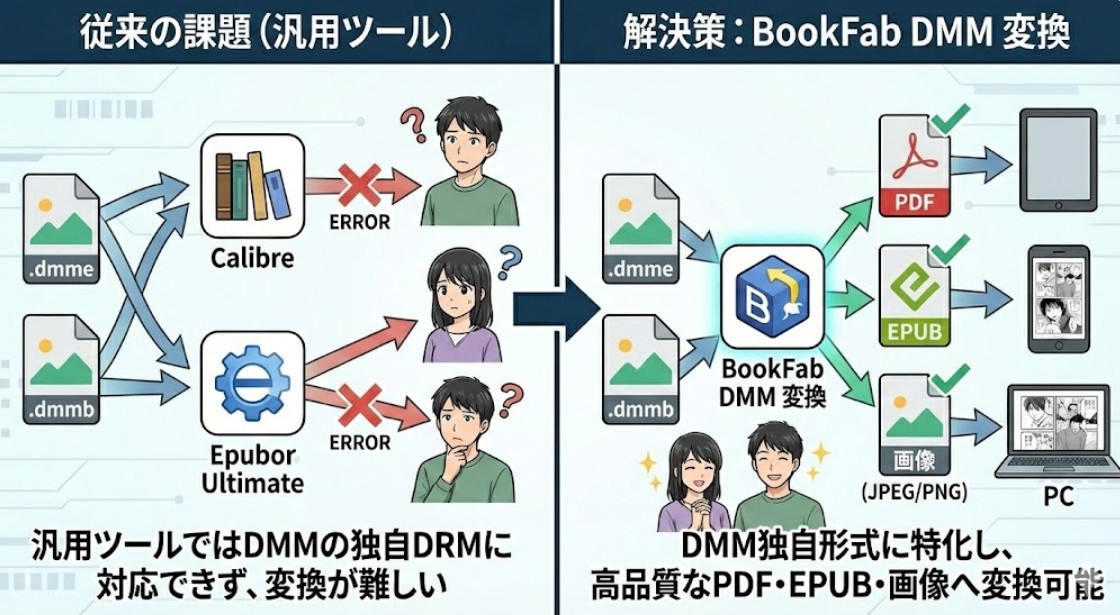 前述した通り、DMMブックスの電子書籍は dmmb・dmme・dmmr といった独自形式で配信され、閲覧は公式アプリを前提としたDRMの仕組みによって制御されています。そのため、CalibreやEpubor Ultimateのような汎用ツールではデータをそのまま扱えないケースが多く、「変換したいのに方法が見つからない」「別の形式で保存して整理したいのに難しい」と感じる人が多いのが現状です。