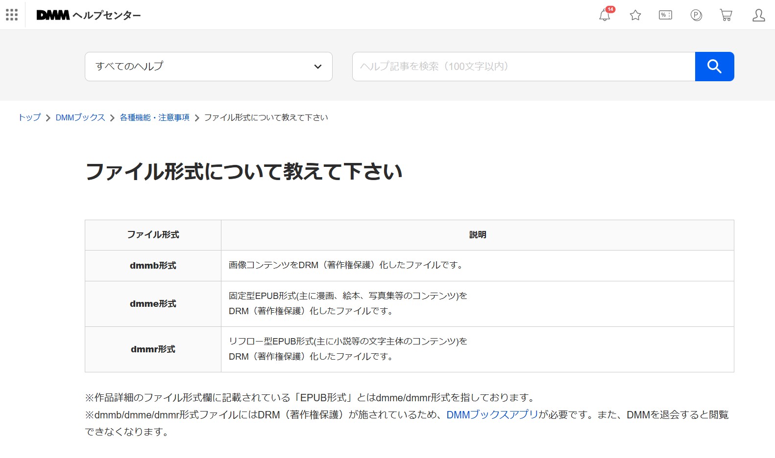 作品ページのファイル形式を確認するのが早いです。DMM系の案内では、dmmb・dmme・dmmrはDRMがかかった形式として扱われ、特に作品詳細の表示でEPUB形式と書かれている場合はdmmeまたはdmmrを指す、と整理されています。