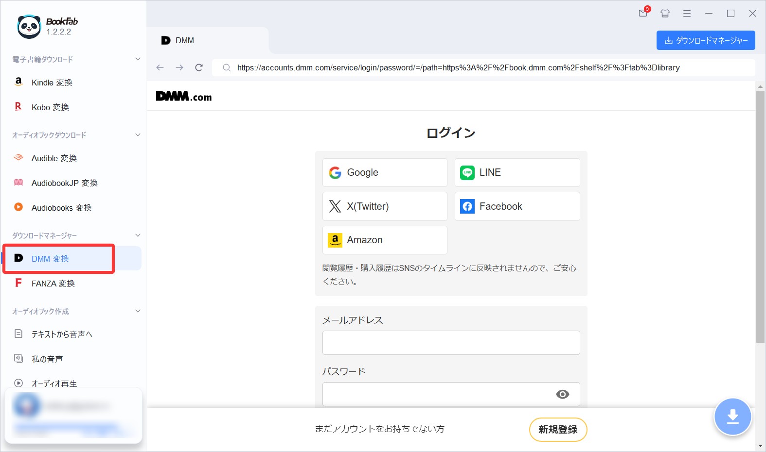 PCにインストールした「BookFab」を起動し、左側のメニューから「DMM 変換」を選択します。