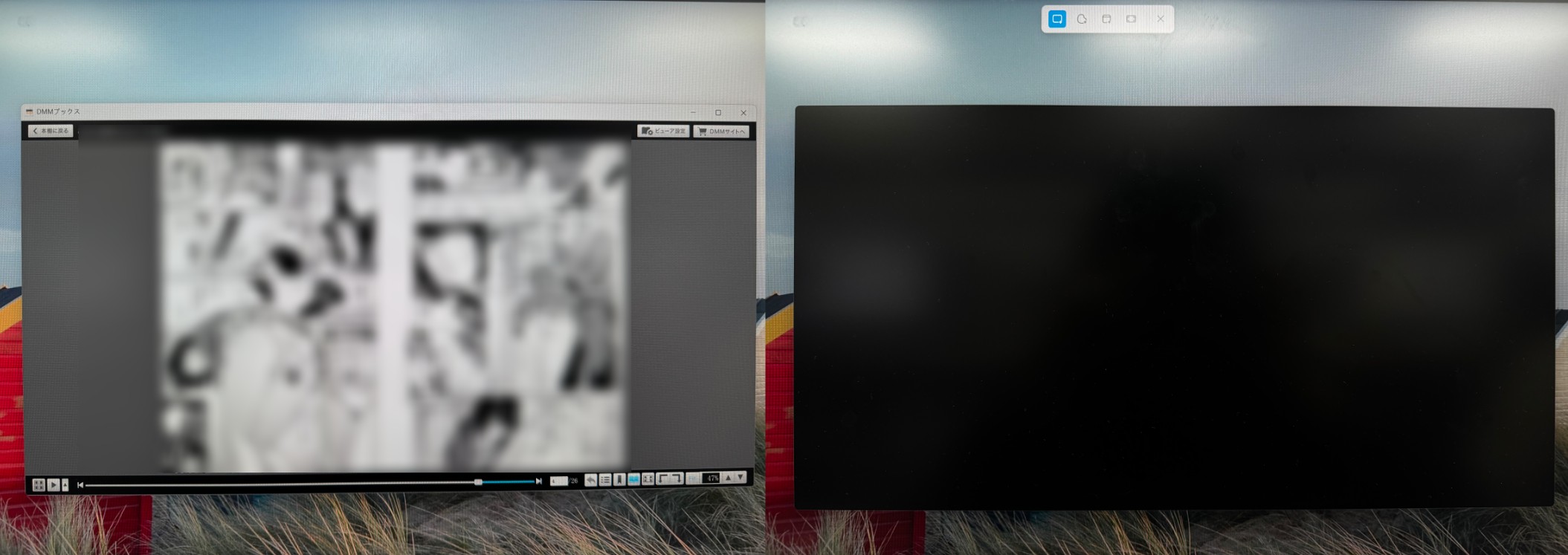 しかし、実際にパソコンのDMMブックス専用ビューアアプリを起動してスクリーンショットを試してみると、画像がうまく保存できないことに気がつきます。キャプチャしたデータを確認すると画面が真っ黒になっており、肝心の漫画のページは一切写っていません。これはアプリの不具合などではなく、海賊版対策や著作権保護の目的で、公式にキャプチャ防止機能が導入されているためです。