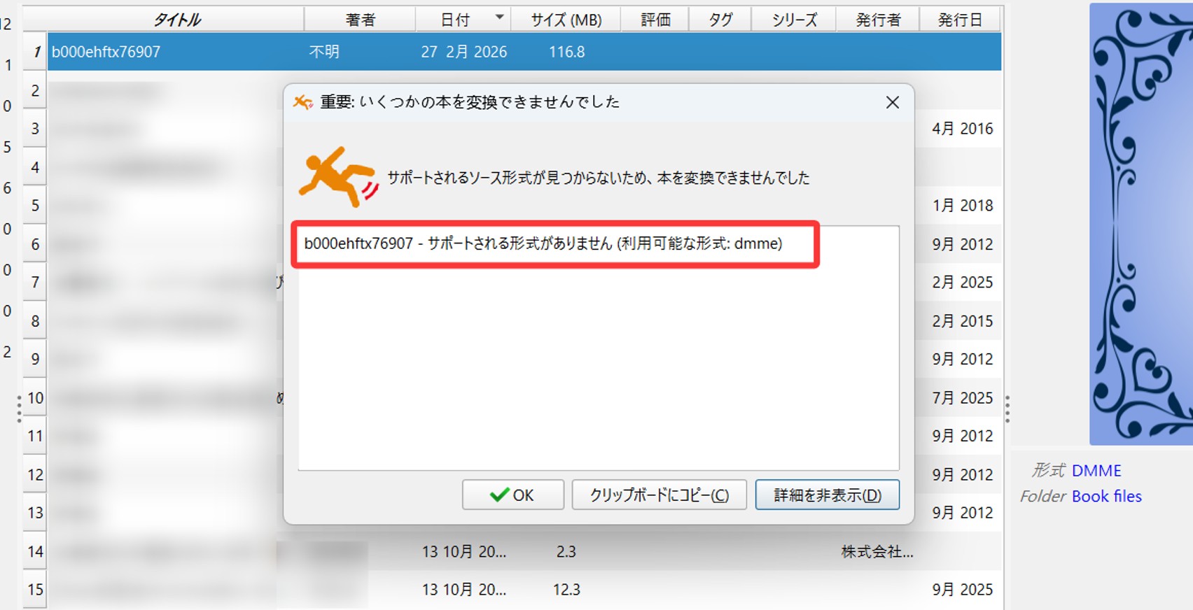 そのため、ネット上で出回っているCalibre用の標準的なDRM解除プラグインを使っても、DMM特有の暗号は解読できません。パソコンから探し出したDMMのファイルを無理にソフトへ読み込ませようとしても、未知のフォーマットとしてエラーで弾かれてしまいます。