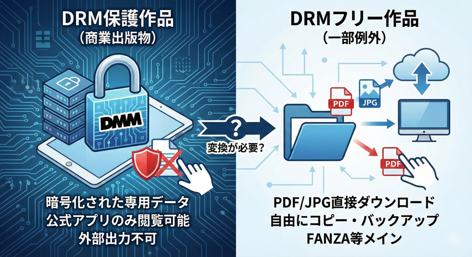 要約: DMMブックスで購入した電子書籍は、公式機能だけではPDFとして保存できません。多くの商業作品は専用形式とDRMで保護されており、無料ツールやスクリーンショットでは実用的な変換が難しいのが現状です。本記事では、なぜ直接PDFダウンロードできないのかという仕組みから、DMM電子書籍変換が求められる理由、そして専用ツールによる解決方法までを順を追って解説します。購入した本を自分の読書環境で管理したい方に向けた実践的なガイドです。