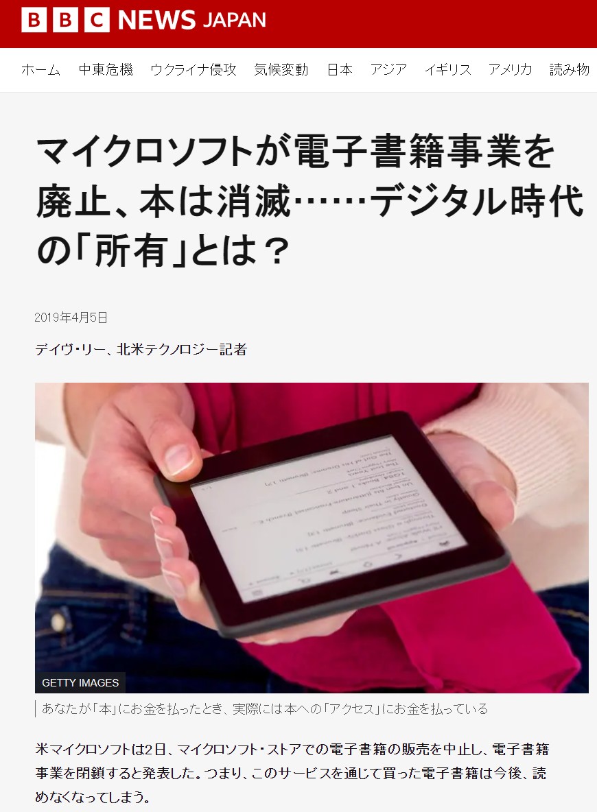 BBC NEWS JAPAN - 『マイクロソフトが電子書籍事業を廃止、本は消滅……デジタル時代の「所有」とは?』より