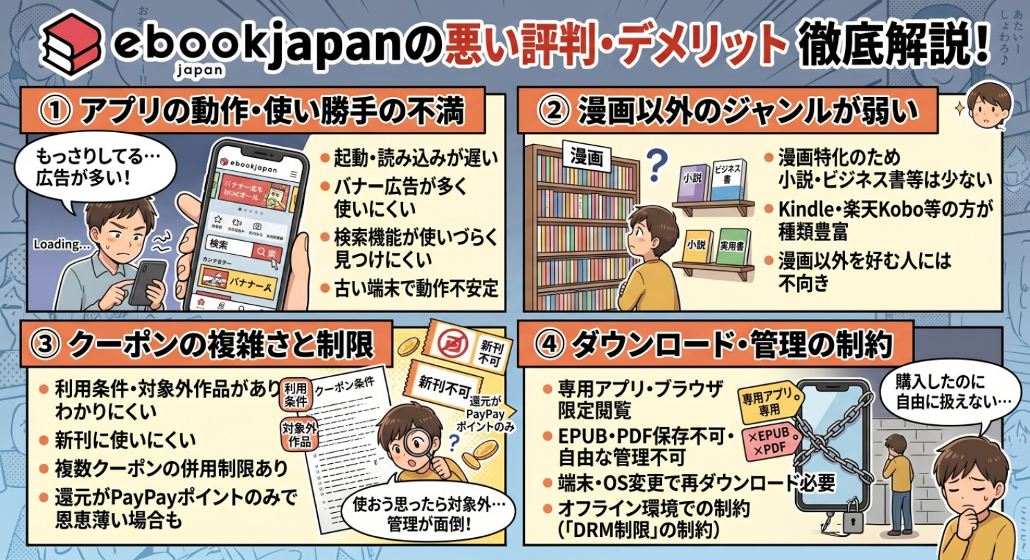 ebookjapanの口コミ・評判には、批判的な意見も少なくありません。特にアプリの使い勝手や、コンテンツの幅、制限面での不満が目立ちます。