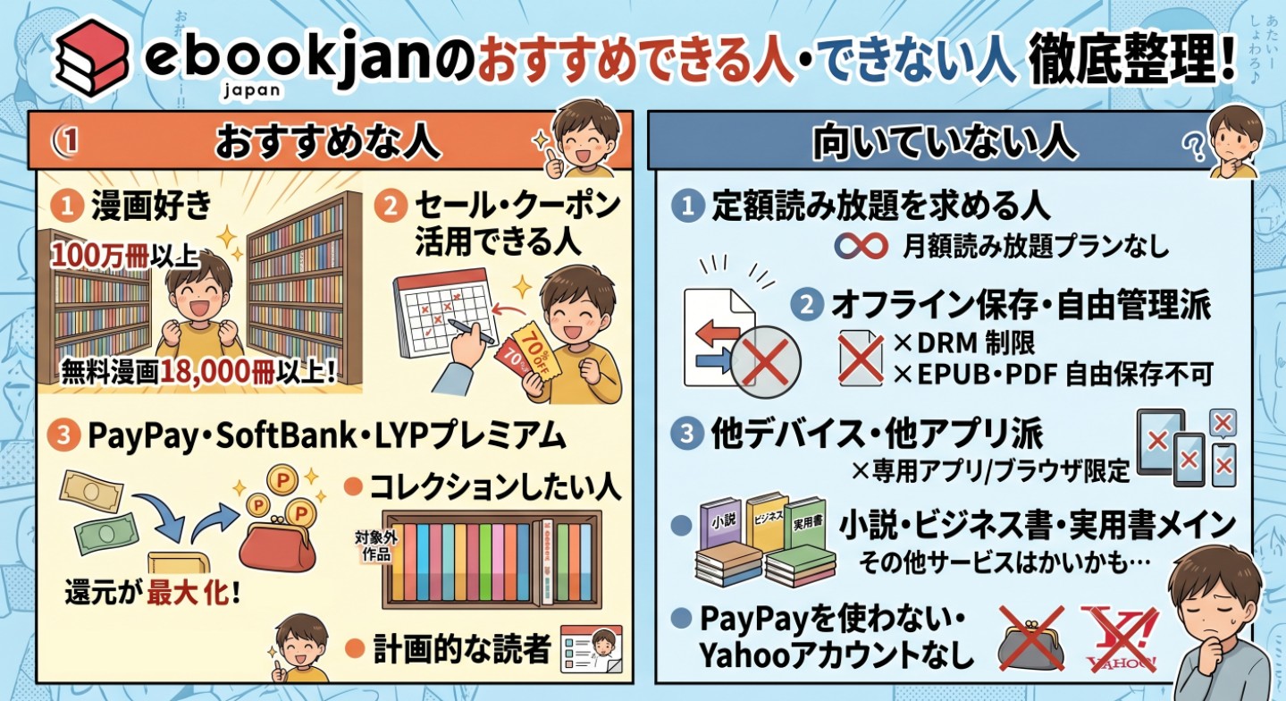 ここまでの評判・口コミ・サービスの特性を踏まえて、ebookjapanが向いているユーザーと向いていないユーザーを整理します。
