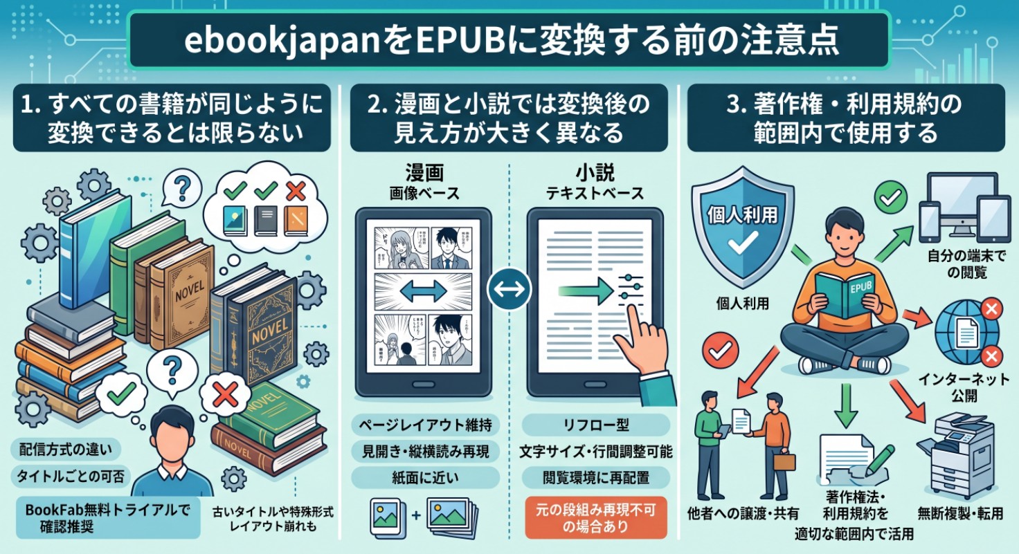 すべての書籍が同じように変換できるわけではありません。ebookjapanの書籍は配信方式や内部構造が作品ごとに異なる場合があるため、変換の可否やクオリティはコンテンツによって変わる可能性があります。BookFabの無料トライアルを活用して、まず試してみることをおすすめします。