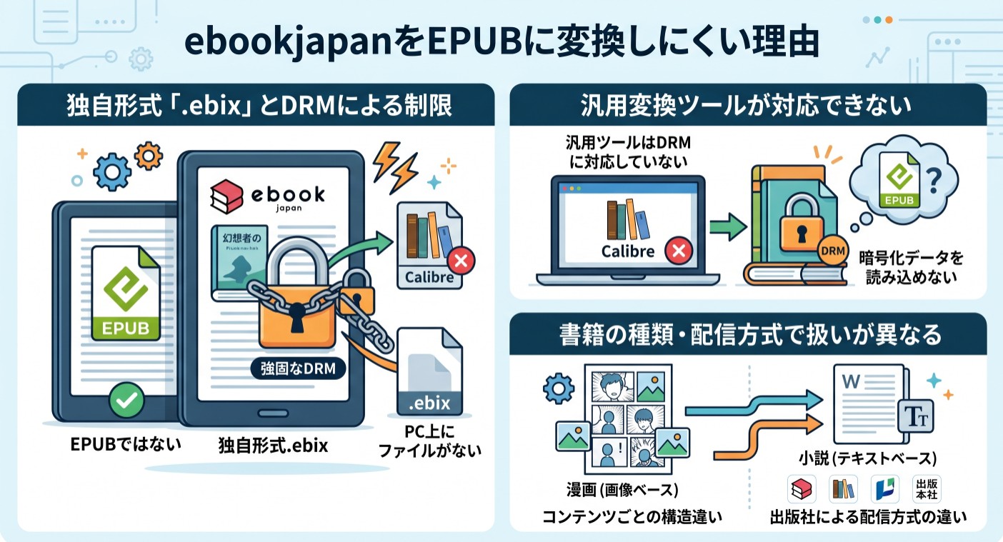 Calibreなどの無料ツールはebookjapanの独自DRM(.ebix形式)に対応していないため、そのままでは変換できません。汎用ツールはすでに手元にある変換可能なファイルを処理するためのものであり、ebookjapanのようなサービス内コンテンツへの対応は設計外となっています。ebookjapanに特化した専用ツールを使う必要があります。