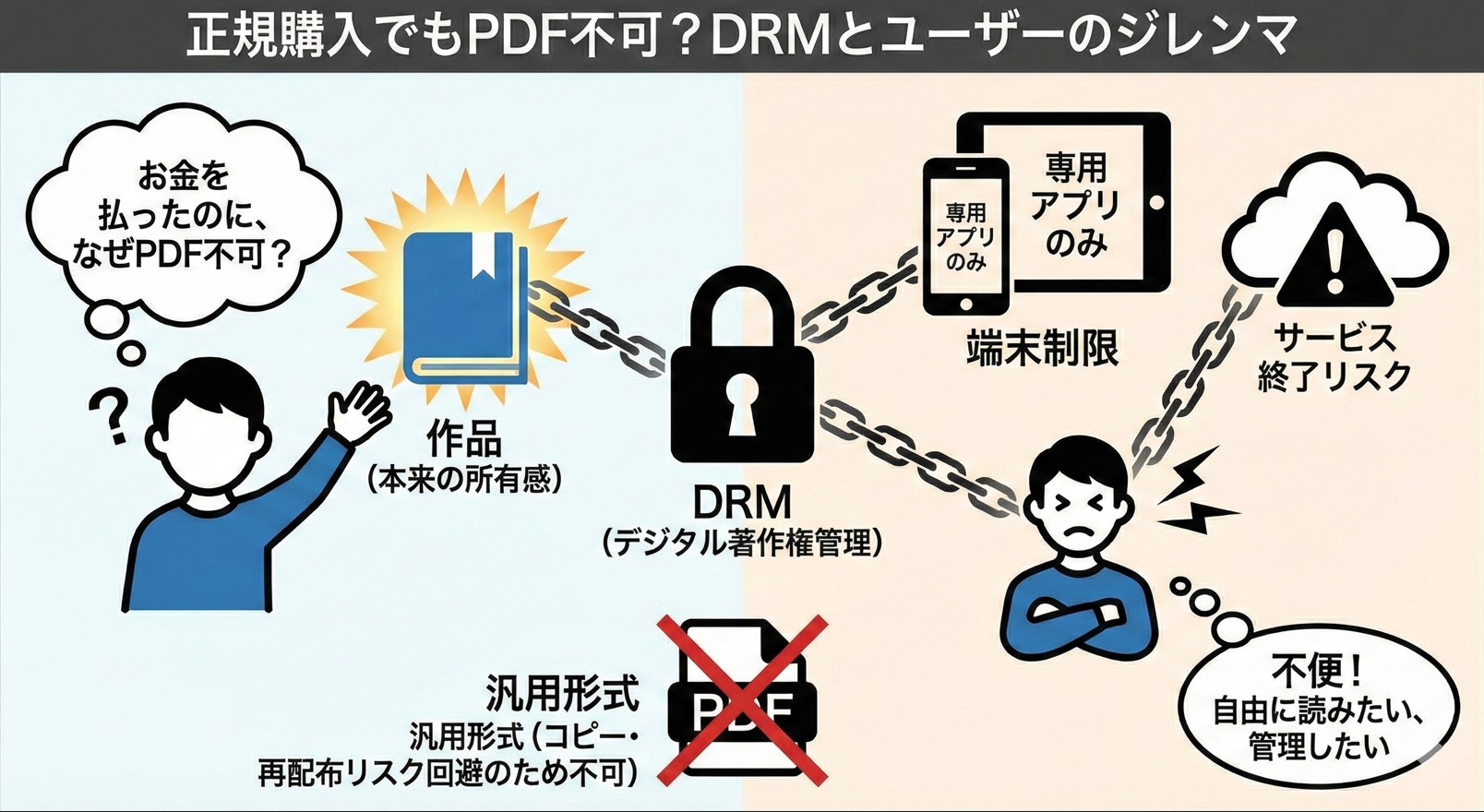 DRMが使われている理由自体は、違法コピーや無断転載を防ぐためです。しかし、その制限が強くなりすぎると、問題は別のところに出てきます。多くの正規ユーザーは、作品を他人に配ったり、違法に公開したりしたいわけではありません。