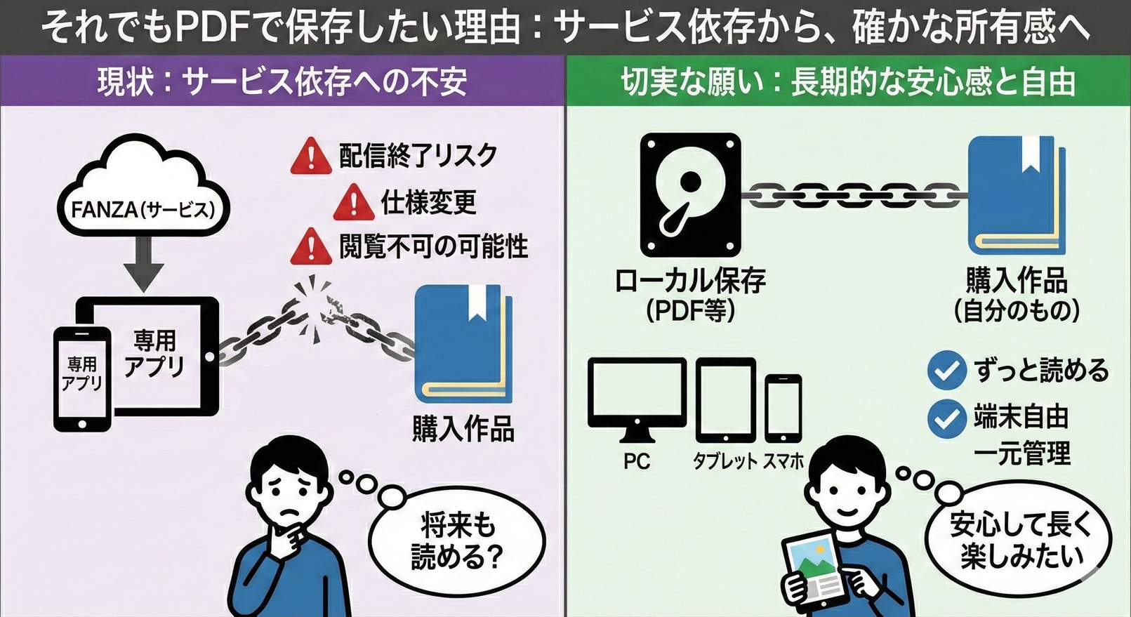 ここまで述べてきたとおり、FANZAの商業作品をPDFとして保存することには、形式や仕組みの面で多くの制約があります。それでもこの要望が長く消えずに残り続けているのは、単に「便利だから」という理由だけではありません。