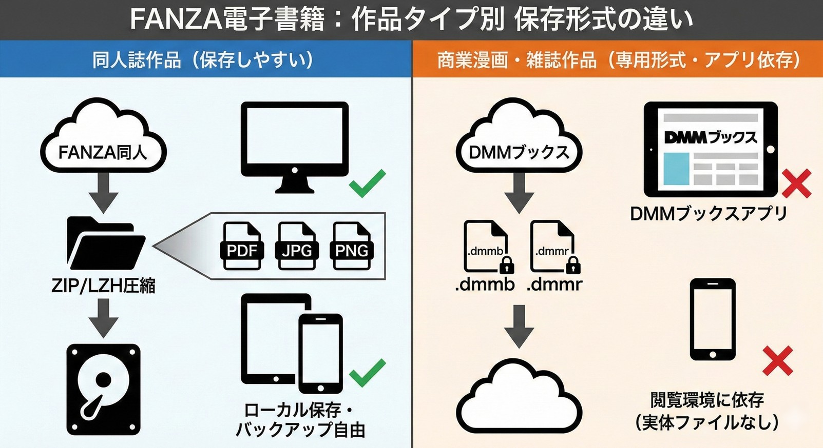 この違いは、単なる技術仕様の差ではありません。購入後にどの端末で読めるのか、オフラインで閲覧できるのか、バックアップが可能かといった点に直結し、電子書籍を「どのような資産として扱えるのか」という認識そのものに影響を与えます。そのため、FANZA電子書籍を購入・管理するうえでは、最初にこの保存形式の違いを理解しておくことが重要になります。