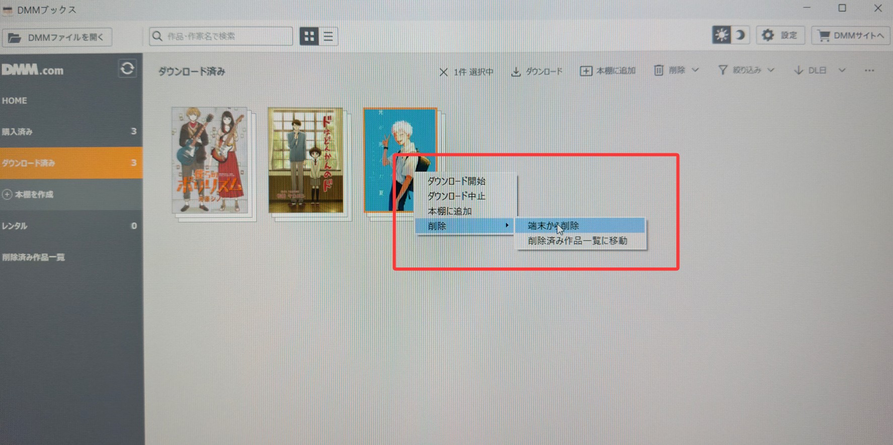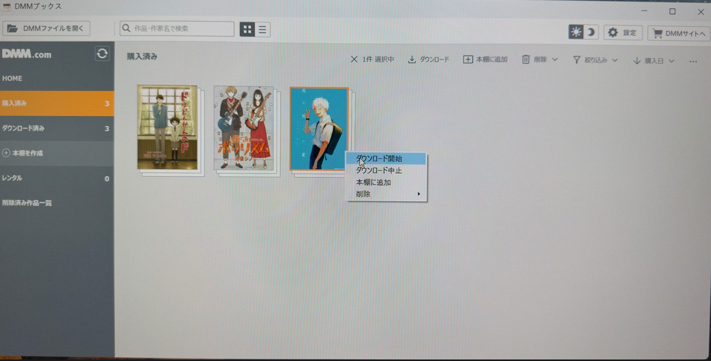 DMMブックスからダウンロードした作品を削除する手順(PC版アプリ):