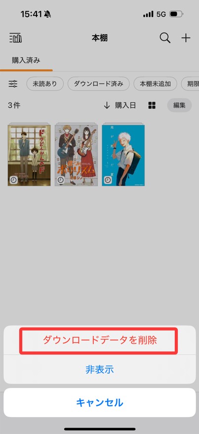 - 削除操作は「ダウンロードデータ」のみ削除するもので、マイページ上のライブラリから作品が消えることはありません。