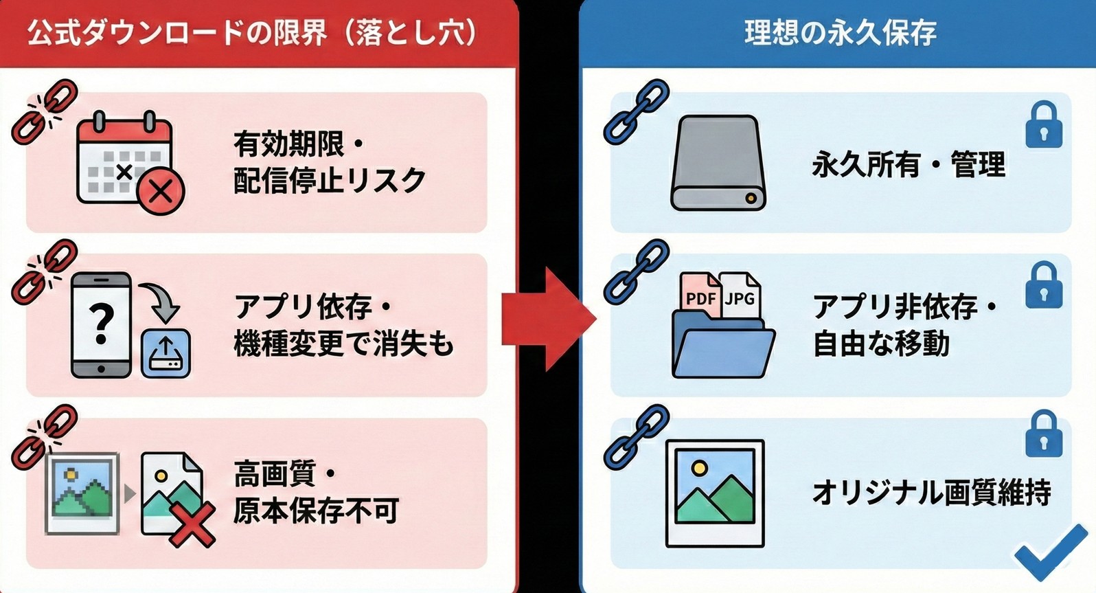 公式ダウンロード機能の落とし穴:有効期限のリスクと画質の限界