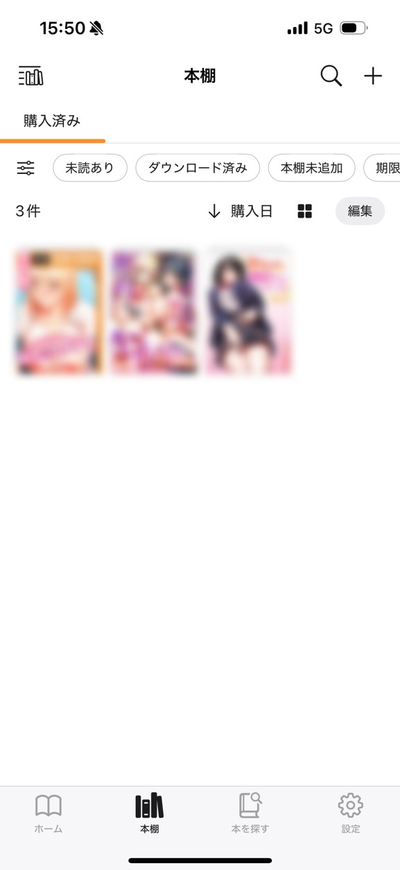 ログインが完了すると、画面下部にある「本棚」タブから、これまでに購入したFANZA漫画や写真集、電子書籍の一覧を確認できます。
