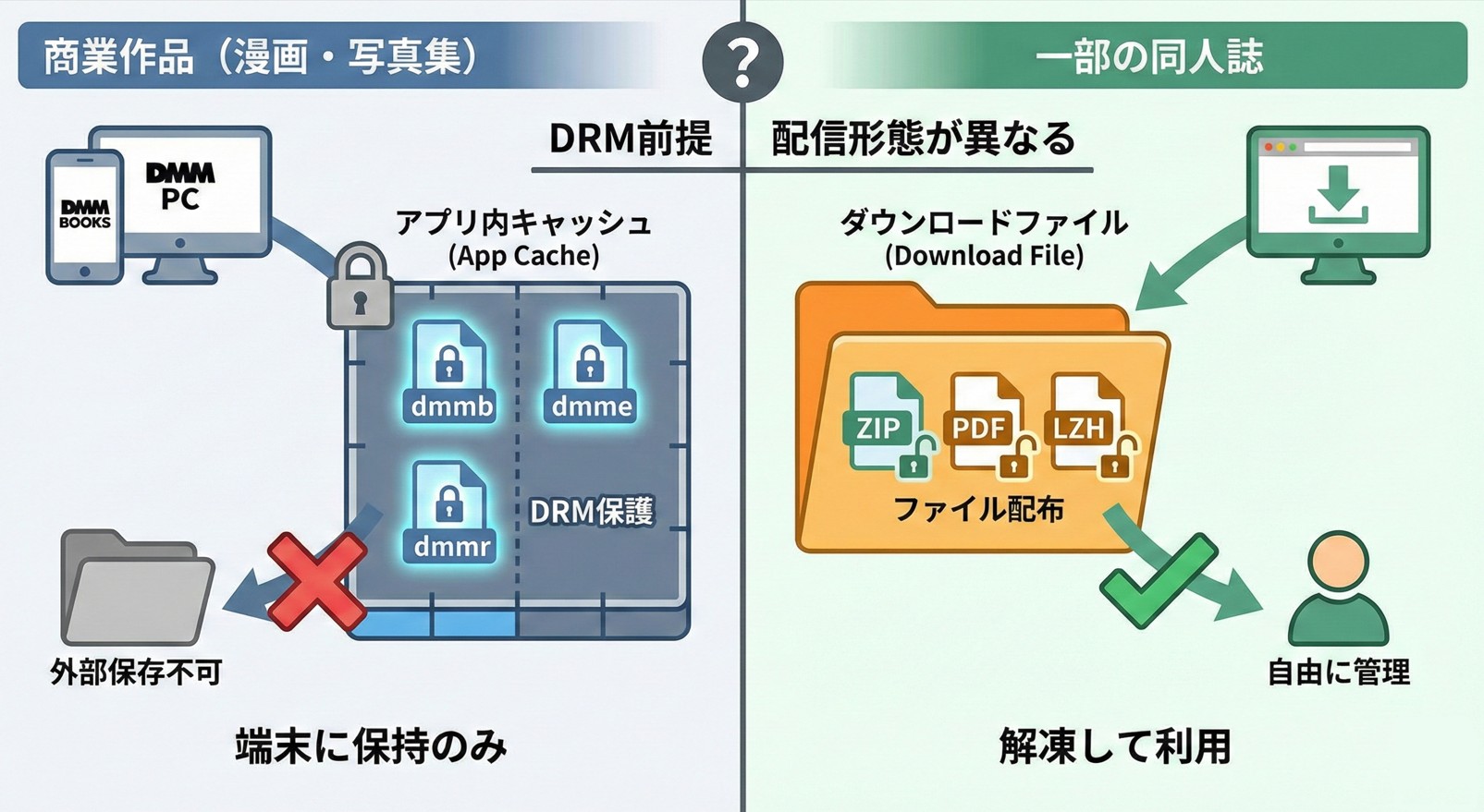 FANZAで「漫画をダウンロードした=端末にファイル保存できた」と思いがちですが、商業作品(漫画・写真集・電子書籍)の多くはそうではありません。実際にはDMMブックスの仕組み上、作品データはDRMで保護された状態で管理され、アプリ内で読めるように端末内に保持されるだけ、というケースが中心です。dmmb/dmme/dmmrといった形式にはDRM(著作権保護)が施され、閲覧にはDMMブックスアプリが必要だと案内されています。